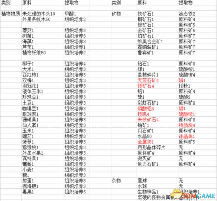 大部分的物质提取完都是基因材料、组织培养和原料矿,有些特殊的已经用红色标出