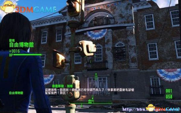 上前和博物馆阳台上的普雷斯敦•加维说话,他说博物馆里有一群居民,那些掠夺者已经冲进去了,要主角拿一把雷射毛瑟枪帮助他们。完成任务“超越时空”,解锁任务“自由钟声响起”。