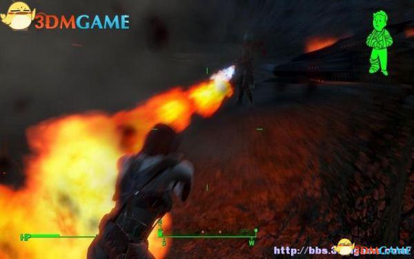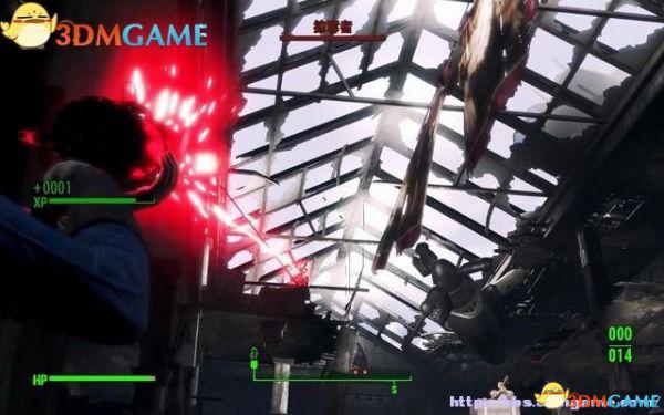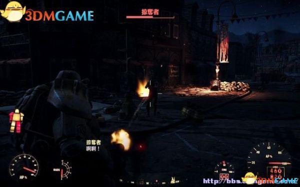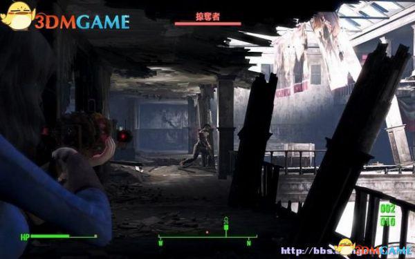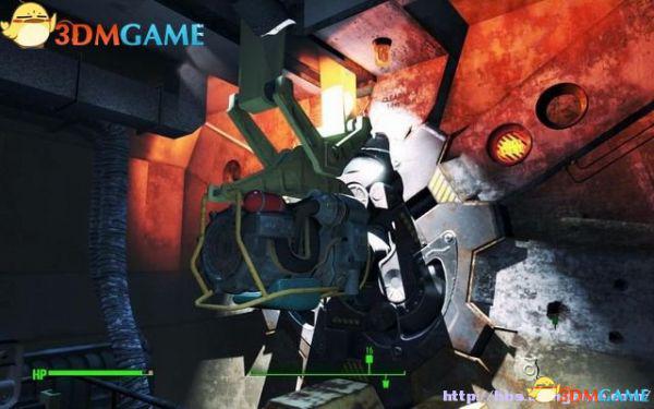 将身上的核融合核心放进去,就可以穿上它了。离开机舱拾取旋转机枪,从屋顶纵身跳到街道上清剿掠夺者。体验一下旋转机枪的使用,射击有一定时间的迟缓,并且持续射击会过热。
