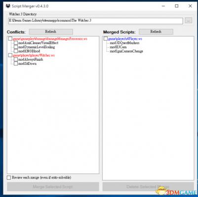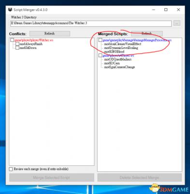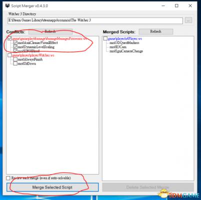 2. 如图中一样,把有冲突问题的那一组mod打剔,然后按Merge Selected Script