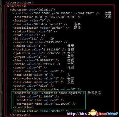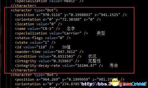先把红色框部分的代码复制一份,插入到</character>的下一行,然后修改以下参数。位置和方向决定了小人所在的位置和面向哪里,如果你不知道要设置多少合适,不要紧,让他跟原来的值一样就可以了。因为进入到游戏以后,小人会自己走动,所以位置重叠是没问题的。