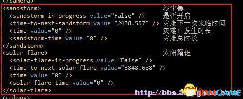 其中“是否开启”的值改成True会立即开启该灾难,其余的时间值单位均为秒。下文涉及到的时间修改,如无特殊说明,单位均是秒。注意一下,如果你玩的是第一个行星,游戏设定是无太阳耀斑的,所以修改太阳耀斑的部分是无效的。