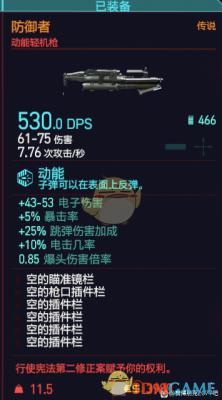 《赛博朋克2077》中的传说武器防御者是比较稀少的动能轻机枪,这把枪的具体获得方法是到歌舞伎街转盘的武器老板那里买,如果没找到的话可以多刷几次,就是需要的钱有点多,属性如下图。