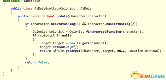 而我们看到,如果在findneareststanding(查找最近的目标)函数阶段,所有的目标都在范围之外,那么这个函数将会返回一个空值,下面一阶段的if条件不会被 满足,然后整个大函数会返回一个false的值,这也就代表了在任务优先级列表中,第一个优先级的任务(攻击殖民者)的条件不满足,开始按顺序进行优先级列表中的下一个任务。