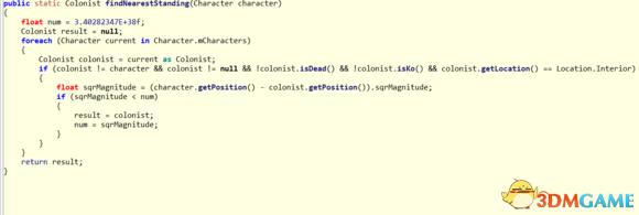 这里就很明了了,该函数会枚举所有你的殖民者们,并且如果它们当前状态不是死亡,或者被打倒的状态时,函数会计算一个限制距离内所有殖民者中离你最近的一个,并把结果返回上一级。