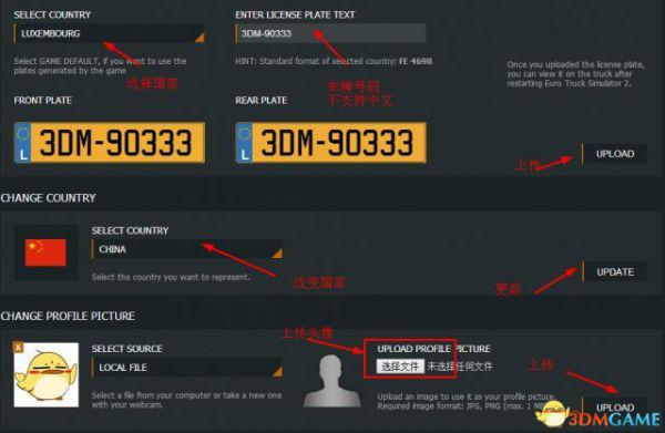 车牌的左上角是国家,右上角是车牌显示的内容,注意:不支持中文!!下面2个车牌左边是前面的,右边是后面的,有的国家前后是不同的,最下面是自定义头像