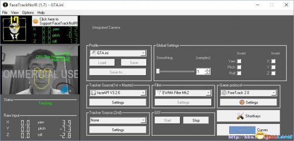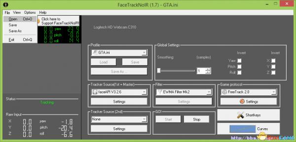 5. 执行 FaceTrackNoIR 用Load调用刚才复制的 GTA.ini 或者按照下列各图设置项参数(直接调用 GTA.ini,完全忽略作者的参数截图)
