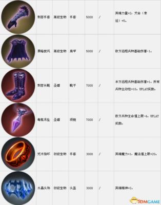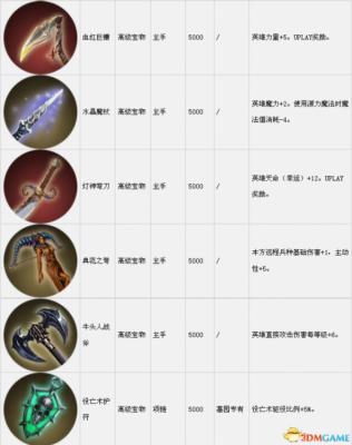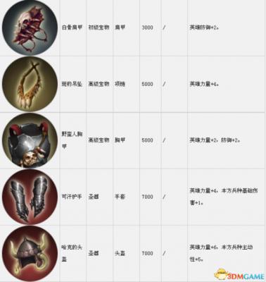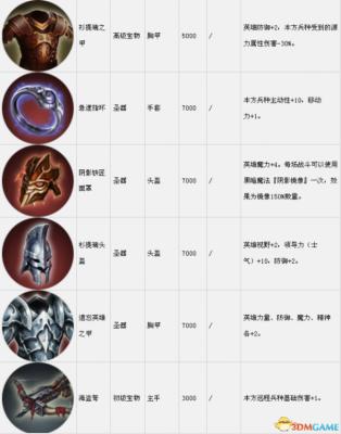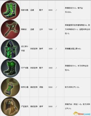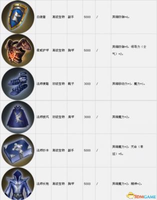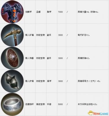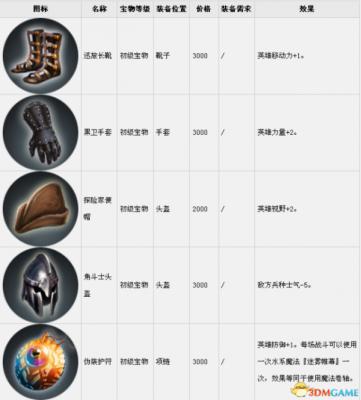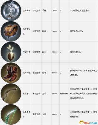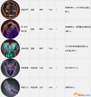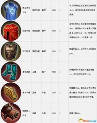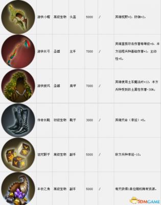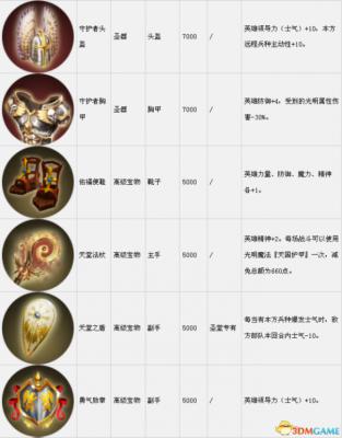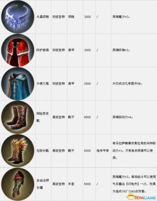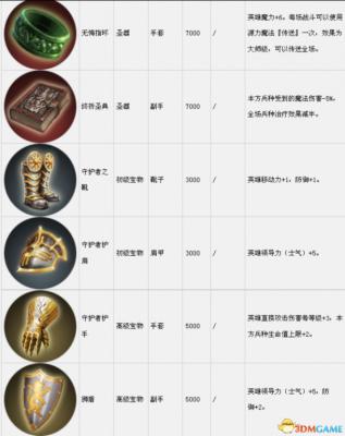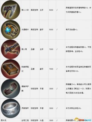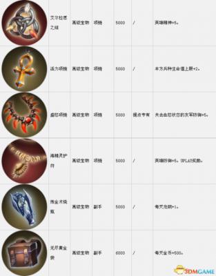 套装组件可以在战役中传递到下一关。表中的宝物售价是购买价,出售价按20%算。