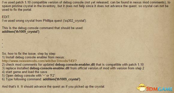 第四步:按“~”调出控制台,输入 additem(’th1009_crystal’) 水晶直接取得,做任务吧!