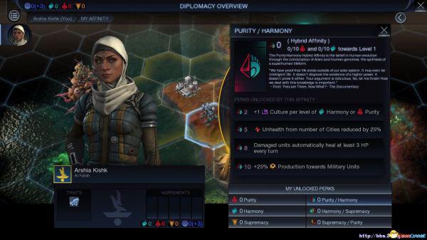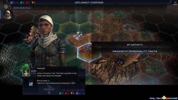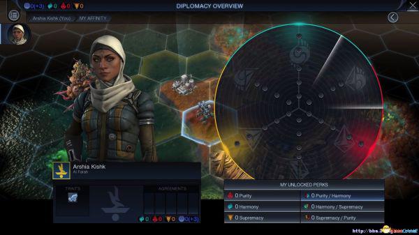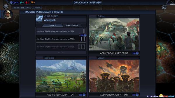 UC可以升级,然后还能买些不同的特性以区分发展方向——看起来是这样,分别是政治、种田和军事,所用的都是本作的新资源——策略资本,我不知道3大妈怎么翻译。另外,在图中另一个选项里,每个势力还有独特的专有协议,具体的我也不知道怎么用。