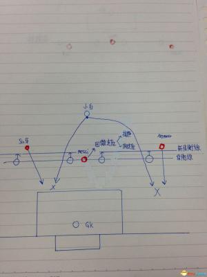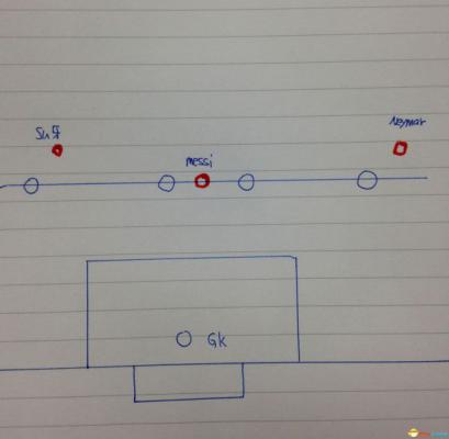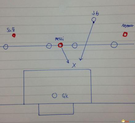 这个就是一个球队锋线球员发挥1+1>2还是1+1<2的关键了,请看第一张图,并且多注意到左右内马尔跟苏牙的站位与梅西的不同,没错,当要发动团体反越位时,这就是标准站位,中锋顶住后卫线,边锋留一步两步的距离,这个是前置作业,接下来如下图: