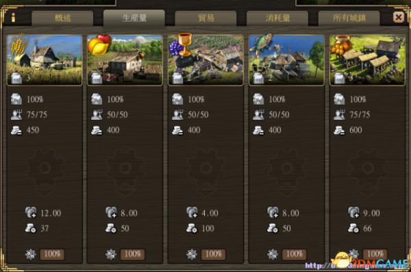 生产量:可以查看产物的生产效率,下面的齿轮可以调节生产效率(调低效率会降低产量和工人,同时降低城市人口)
