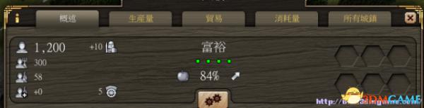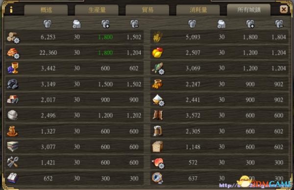 消耗量:从左往右分别是城镇中的产量、商业消耗量(加工所需的消耗,例如生产啤酒需要消耗粮食)、居民消耗量、部队消耗量