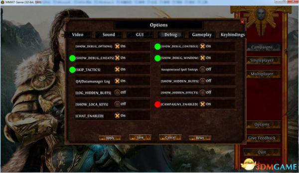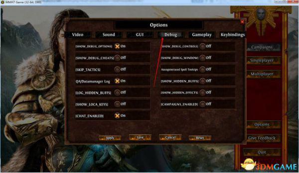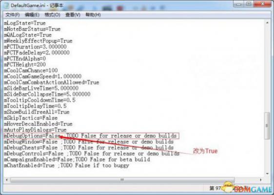 步骤3:修改完成后保存关闭,然后打开游戏主界面上的“选项”菜单,你会发现选项菜单里面多了一栏“DEBUG”如下图
