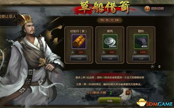 在游戏中一般周一是【草船借箭】。这个游戏的规则是:最多上阵3名武将,坚持10个回合或者直到一方全灭泽借箭结束。