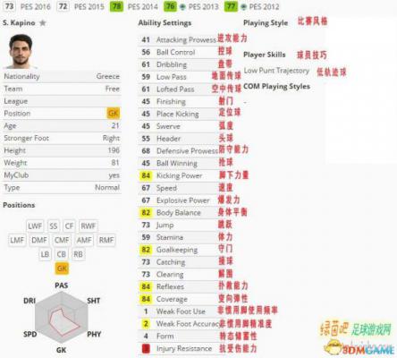 来自奥林匹亚科斯的第三守门员,和PES2014以前版本相比较,比分可以说是骤降,但是,如果你想买一个替补的话,该球员也是一个不错的选择。