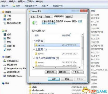 玩家想要修复存档可以对saves文件夹右键-属性,调出以前版本,复制过来即可。