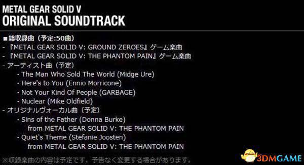 《合金装备》原声音乐集“《METAL GEAR SOLID VOCAL TRACKS & COVER》”其中不仅收录了系列以往作品的经典曲目,还包含《合金装备5 幻痛》中的两首新曲,另外还收录了由Donna Burke演唱的5首主题歌。