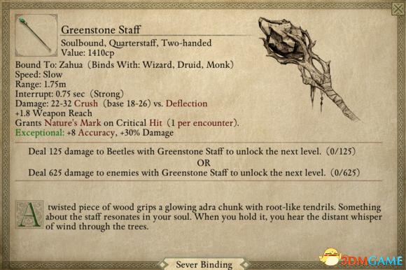 绿宝石杖这档我没解锁完,因为没怪打了。其实它还有4个剩余附魔是 1.击中或重击5%施加石化 2.附加“甲克术”法术 3.附加“铁皮术”法术 4. +15%伤害 +8命中。所以这武器总体上是渣渣,附加的法术没有太大用,而且法师和德鲁伊不会拿它冲上去敲人,武僧也没必要用杖输出。虽然绿宝石杖造型不错但还是压箱底吧。
