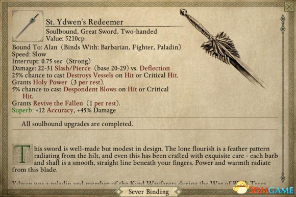 第一把武器---巨剑St.Ydwen’s Redeemer,我来吐槽这剑的造型,其实就是把原来妓院商人卖的Darcozzi骑士剑拉伸了一倍,加了点特效就算新武器了。不过这把剑从能力上来说倒是还可以,完全升级以后附加全体复活魔法,偶尔能救急;当然更关键的是此剑每次攻击有25%概率对vessel系敌人造成即死伤害,但是这属性实在过于bug,估计以后会削,所以想用的同学在现在的版本快多用用,下次可能就没了。