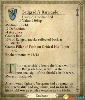 很废的盾牌,附魔格子已经到上限,本身又连精致附魔都没有,导致格挡率奇低,还不如小盾。就算有bash攻击,但还比不上门板。至于10%反弹远程攻击和重击施加“信仰之柱“(居然是 1per rest)也只是添头罢了,实在没啥用处。