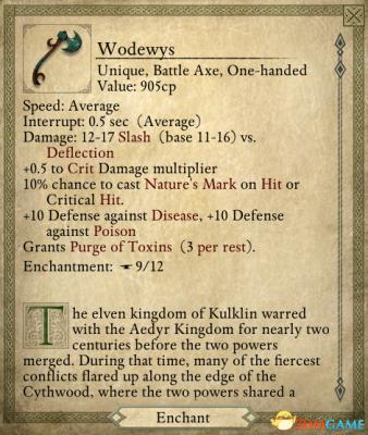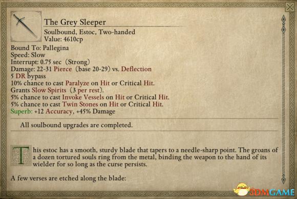 神奇的军刀,居然是腐蚀斩击双重伤害,附加了几个渣渣法术不过也没怎么占格子,有潜力,可堪一用,入手早,一进dlc就可以到russetwood干掉一帮灰白精灵拿到,玩军刀的同学可以试试这武器。