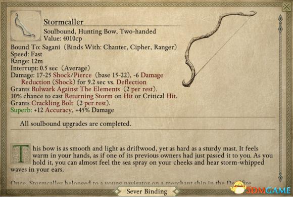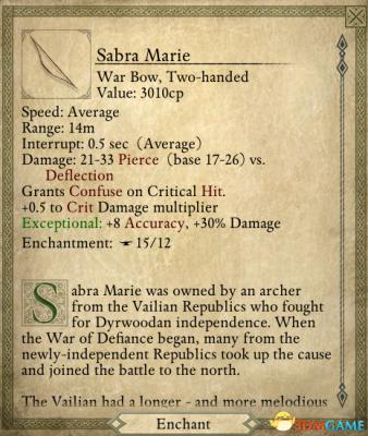 本来可以是神器的弓可惜入手非常晚,这武器在白龙巢穴,但是等到灭了白龙黄花菜都凉了,游戏快结束了。(就算想嘴炮过白龙也要山洞前打一堆超强的鱼人,所以低等级拿不到这弓)Sabra Marie的神奇之处在于它施加的Confuse是不经过豁免判定的,非常霸道,指哪儿打哪儿。相比下,其它的“重击施加XX效果”武器的额外特效要过坚韧。另外这弓暴击伤害惊人,经常打出40+伤害,堪比手枪。