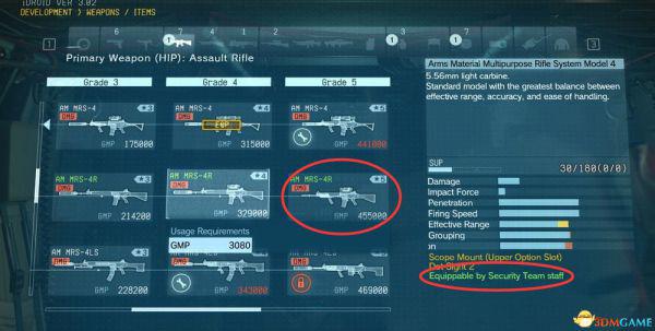 入下图中,红圈中的“☆5” AM MRS-4R冲锋枪对应的就是安全设定中5级装备