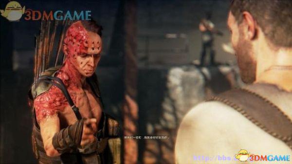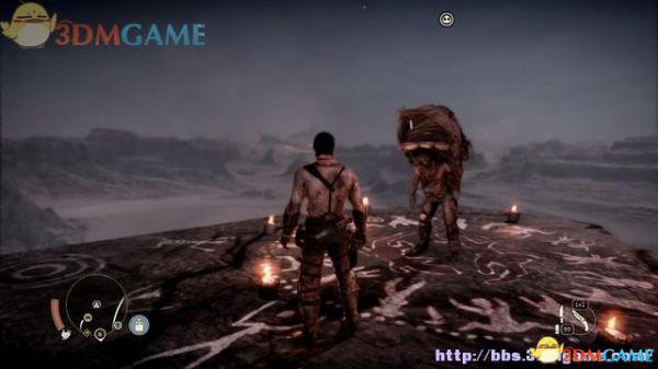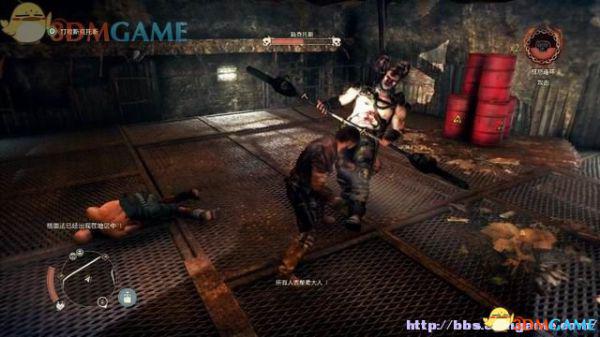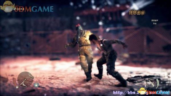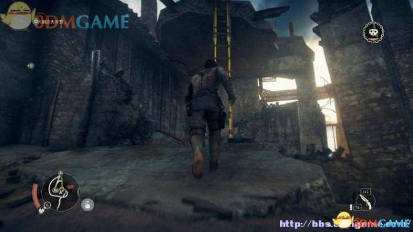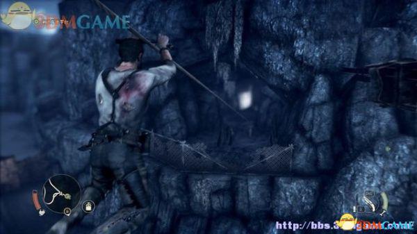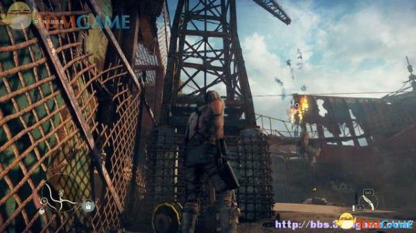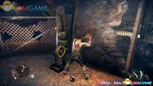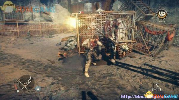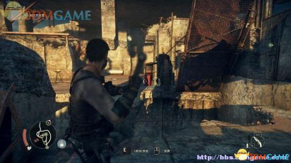 有特殊标记的平台是可以攀援的,往前发现一名杀人越货的战郎,尝试用拳头击倒,或用霰弹枪来轰杀(鼠标右键拔枪)。