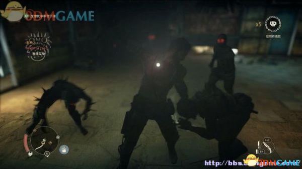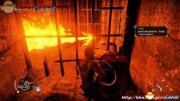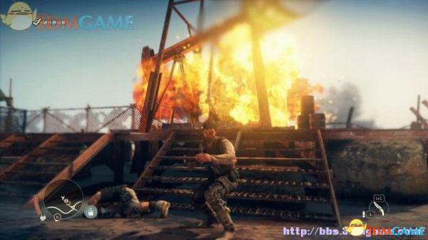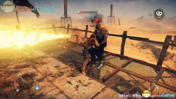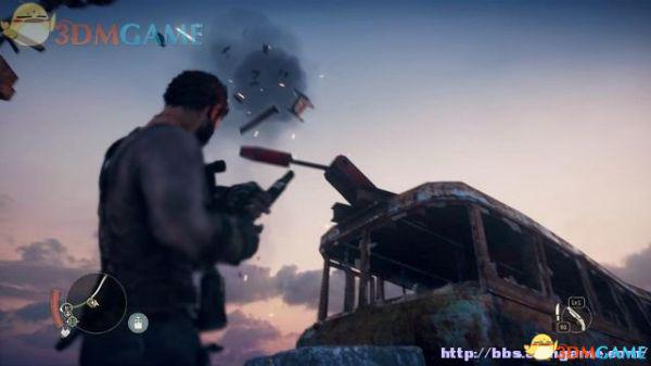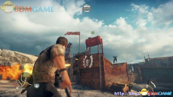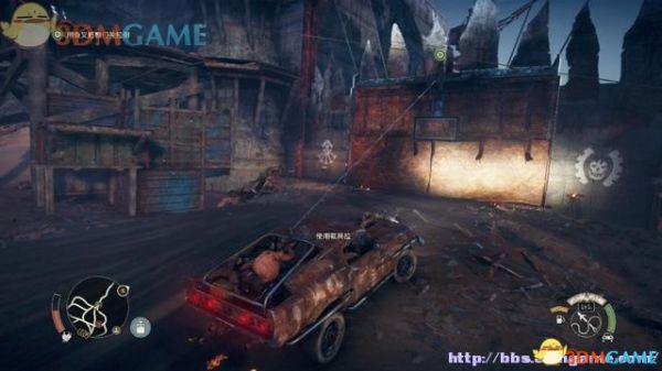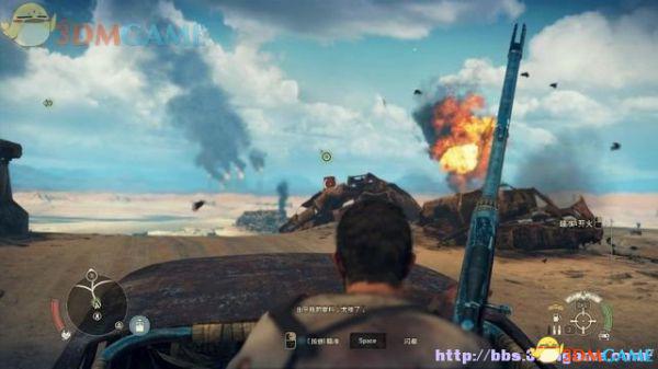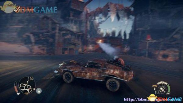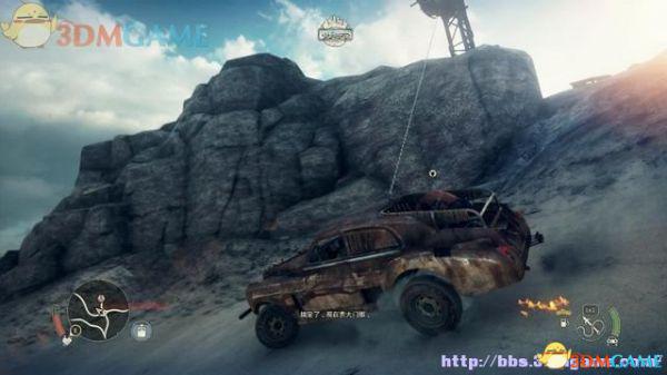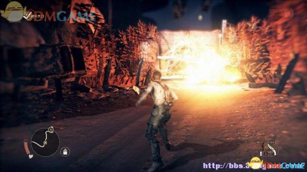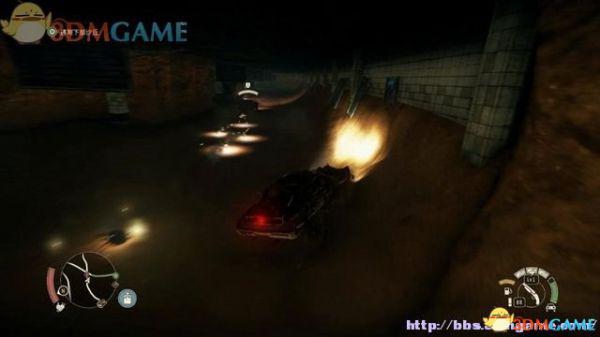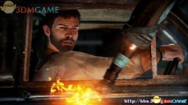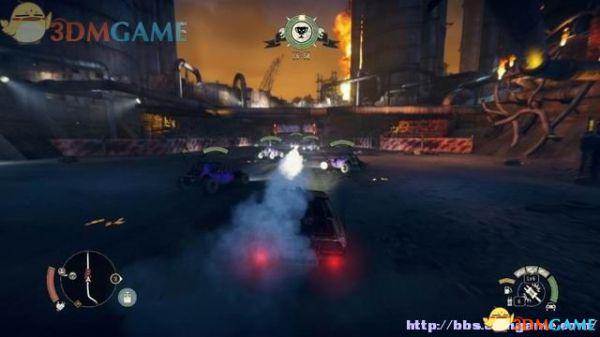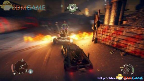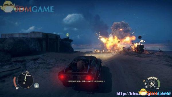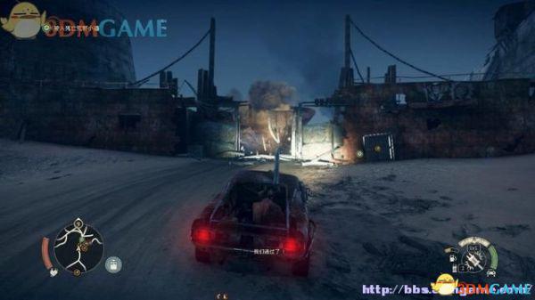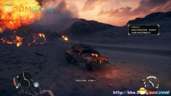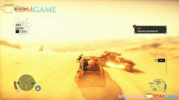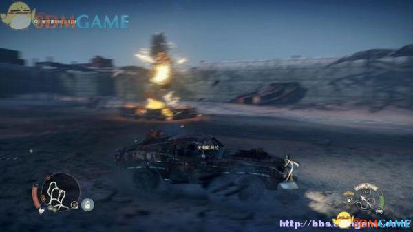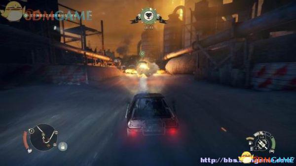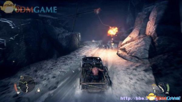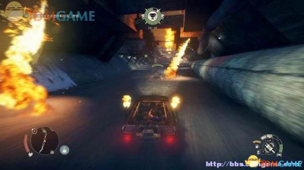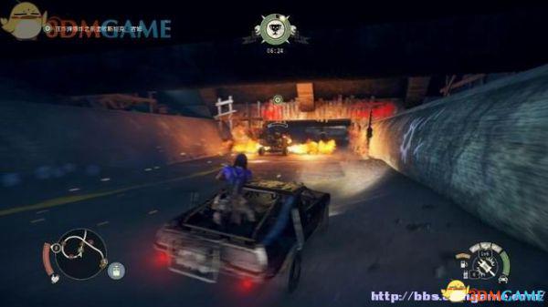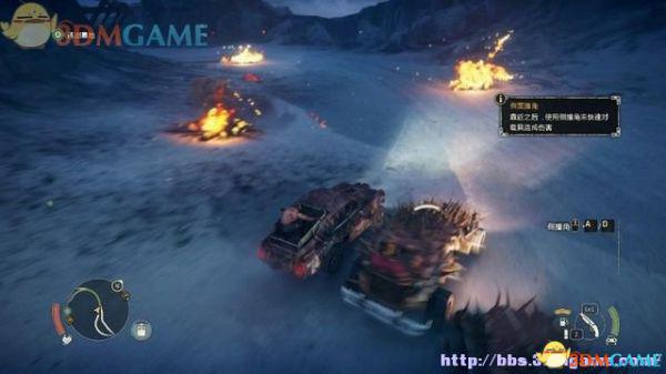 途中的机关仍然运作,会有敌人车辆堵截。这里熟悉一下车辆战斗的技巧,按住鼠标左键和右键射击汽车的弱点,在敌人车辆靠近时,可按住A或D键来侧面撞角。或者改变敌人车辆的方向,逼迫它们撞向火堆或障碍物上。