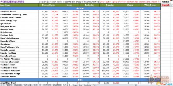 本表记录了通过赌博获取一件特定传奇装备所需要消耗的血岩碎片预期值。黑字为平均值,红字为保守值(80%的人都可以用这么多碎片赌出)。0表示当前职业赌不出该装备。