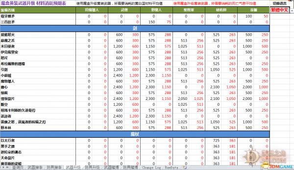 本表记录了使用魔盒的黄装升级功能、获取一件特定传奇装备所需要消耗的材料数量预期值(平均值)。黑字为金蓝白材料数量,红字为死亡气息数量。