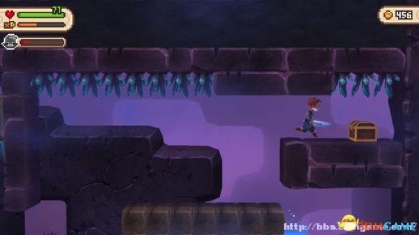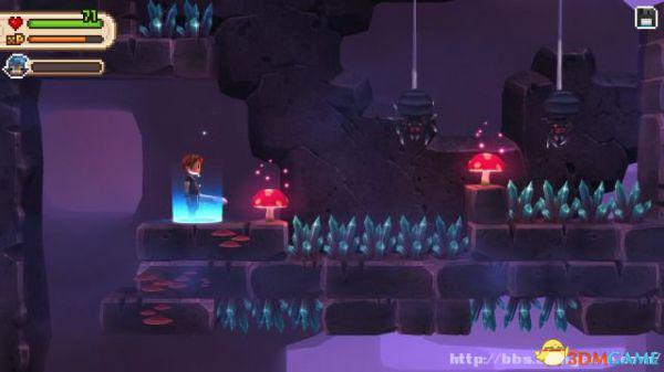 此时要先击败垂吊的蜘蛛,然后借助蘑菇来跳跃避过地面的冰晶。