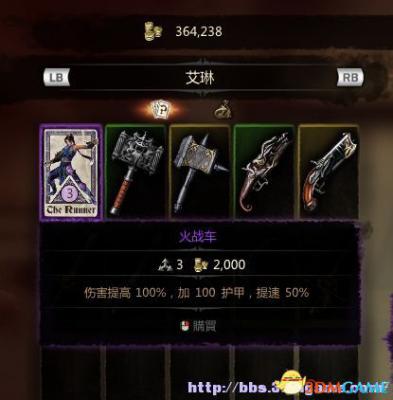 火战车传奇命运卡,伤害加 100%,护甲加 100,速度提高 50%(跟猎人艾琳购买)