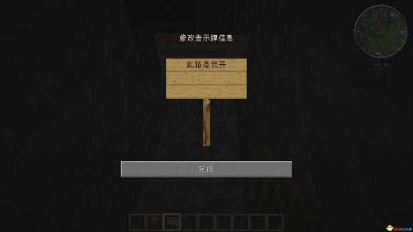 合成出了告示牌,然后就可以使用它了。插好告示牌,然后打上“此路是我开,此树是我栽,要从此路过……”不对,打错了,应该打上“这里没去过”、“向左”、“向右”、“有矿”等等你自己能理解的词,就行了。这个没有什么固定的模式,你甚至可以在上面输入一些暗号。只要你自己不忘记是什么意思就行了。
