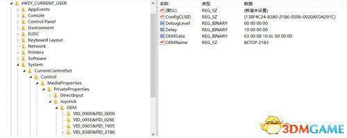 5,双击OEMName项,复制“数值数据”---------其实这就是你的手柄被系统识别的型号,我的是BETOP 2183。
