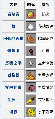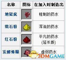 基础材料是所有药水的起点。地狱疣是这个阶段加入水瓶的主要材料,出于它被需要用来制作多数的药水。其他所有的基础材料都只能用来制作"虚弱药水"。
