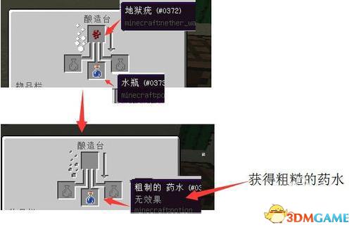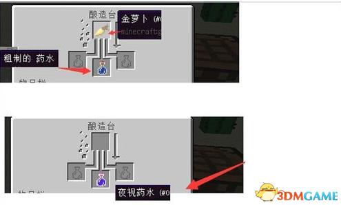 b.合成夜视药水:在酿造台上,先使用地狱疣和水瓶做一个粗糙药水,再使用金胡萝卜和粗糙药水合成夜视药水。
