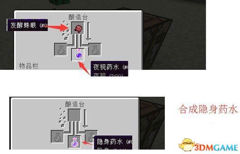 使用发酵的蜘蛛眼和夜视药水合成隐身药水,具体合成如下图,我们使用隐身药水就能隐身啦,不过这样合成的药水只能保持3分钟的效果哦。