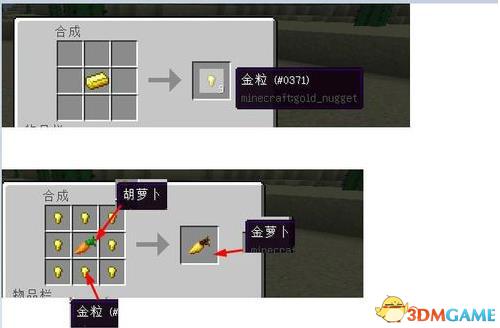 a.合成金胡萝卜:很简单的合成方法!只要用工作台围上一圈金粒在胡萝卜的外面,就能合成了,
