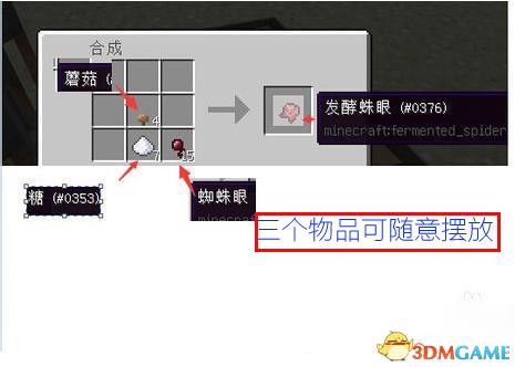 b.合成发酵蜘蛛眼:使用工作台,糖、蜘蛛眼、蘑菇(灰色)随便放在工作台3X3格子中后得到发酵的蜘蛛眼睛。
