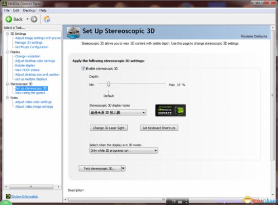 这样N卡驱动控制面板里边的3D模式就多了几种可选,选择普通无源3D显示器即可。