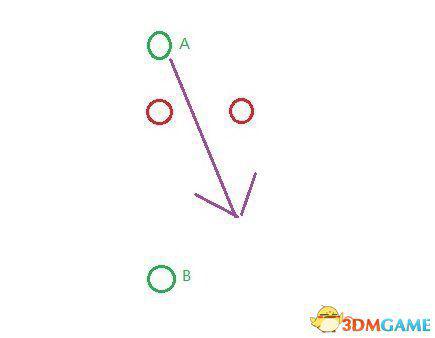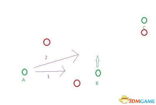 绿色的是我方球员,红色是对方。现在A持球,B静止。在本作中,如果想传球给B,必会走路线1,从而被下方的对方球员轻易断掉。