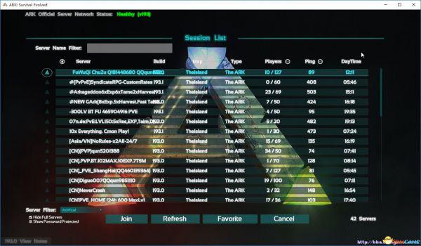 步骤七: 成功进入游戏点击"JOIN ARK"后左下角的Server Filter:选择UnOfficial 非官方服务器。刷新。就会出现破解版服务器,现在服务器有42个。