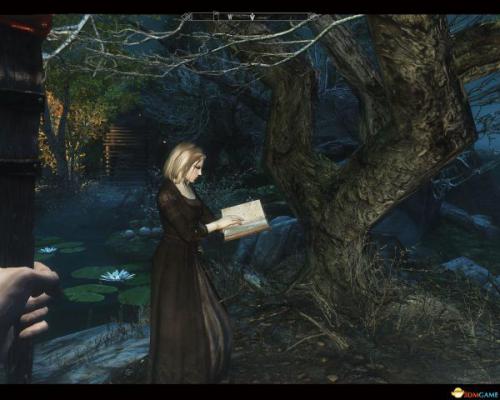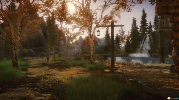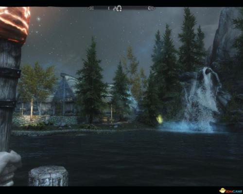 入夜之后的小镇柔和静谧,有兴趣的话可以站在山崖边上欣赏夜景,红月当空下的群山似乎已沉睡,萤火虫和月娥在眼前飞舞,路灯照亮小镇的街道,NPC们会有自己的夜生活,比如法师公会的成员会来到树下借着月光看书,居民泡酒馆或者在镇上散步,有两个可以邀请成为同伴的家伙坐在小桥上静静看着瀑布从山上倾泻到脚下的水塘里,而池塘里能见到4代里的水生植物帝王莲,可惜不能采。假如作者在镇上添加玩家住宅的话,一定很受欢迎吧。