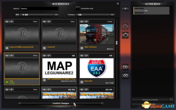 第三步:将左边(Map)地图MOD往→右并点击下面的 Confirm Changes 进入欧卡2启动界面点击新建立的角色继续游戏即可!