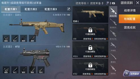 3、装置界面,就可以自由搭配武器的配置了,解锁新的枪械需要满足一定的团竞等级个消耗团竞军备;