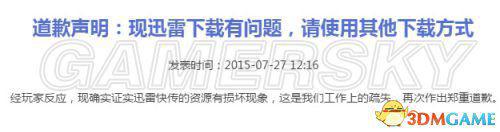 游戏的官方已经为游戏资源的损坏发出了道歉的文章,并且给出了解决方法:无损坏的游戏的下载渠道,玩家用其它下载渠道游戏进行安装。