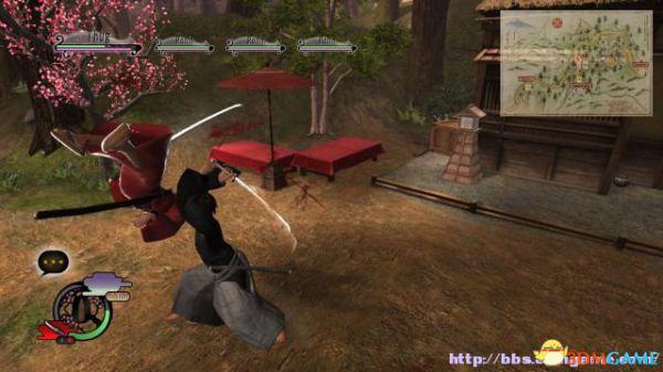 如果你留意到屏幕左下角的两个槽(一个紫色一个绿色),绿色代表你的生命槽,如果生命值耗尽,那么你就会死亡。紫色的是活力槽,这是《侍道》新引进的活力值,有些事物会影响到它。