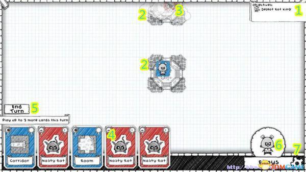 结束回合按钮(5):如果不想继续放置卡牌或不想放置卡牌,那么可以点击“结束回合”按钮,当勇者完成一次行走后(或一次行走外加一场战斗),下一回合就开始了。
